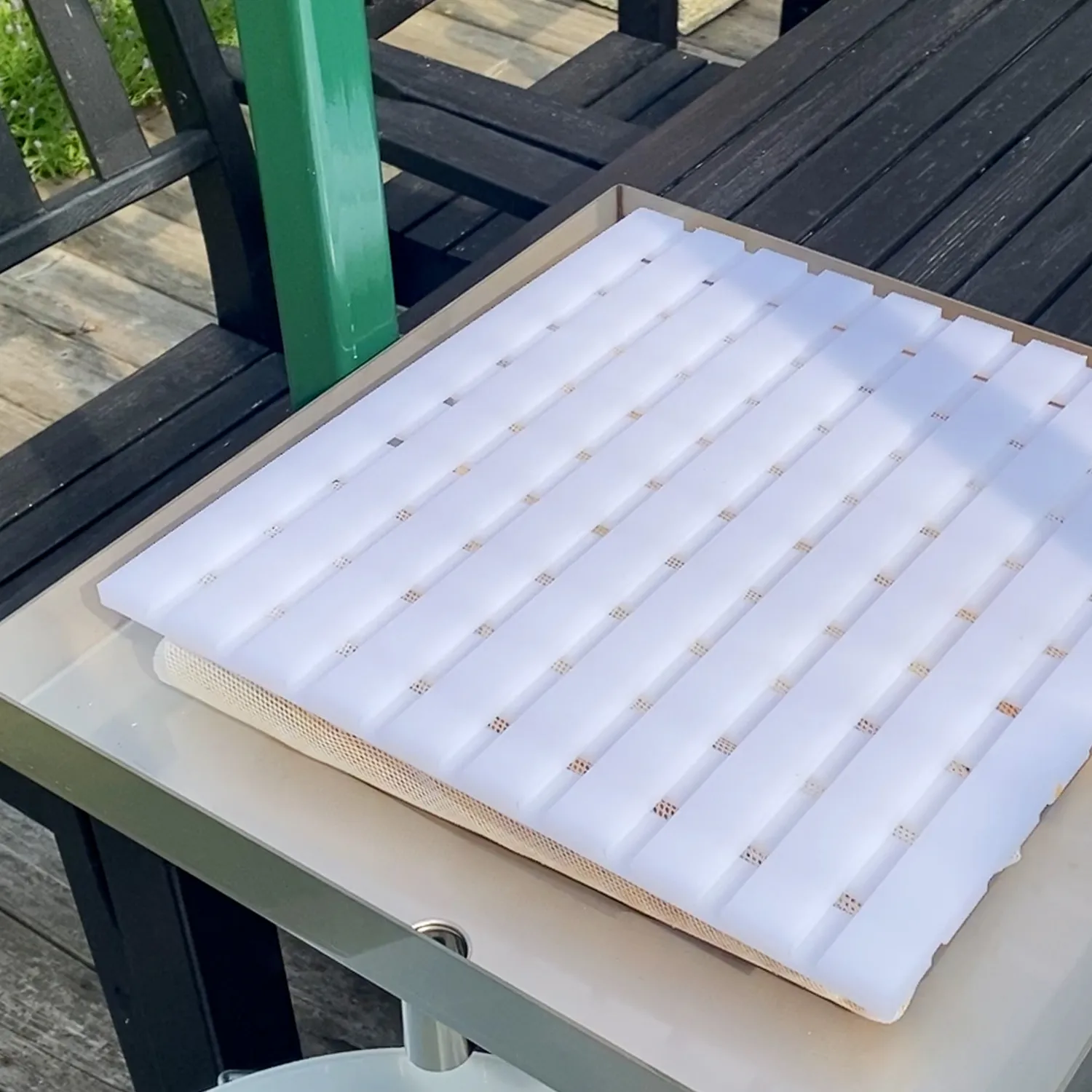 Denna placering gör det enklare att fylla fruktkrossen jämnt och att sedan vika in duken över fruktmassan. Rombformen ger stabila lager och bidrar till en jämn och effektiv pressning.
