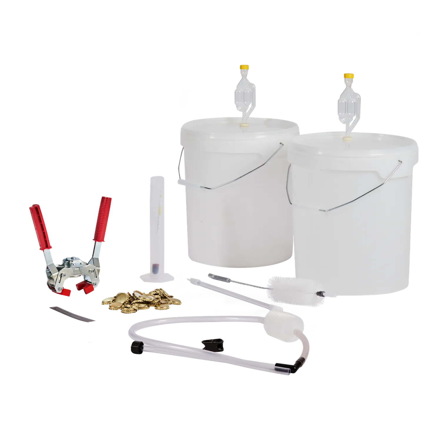 Paketet innehåller hydrometer, termometer 2-26 °C, mätglas, två jäshinkar 16L med lock, två jäsrör, hävert, flaskborste, flaskfyllare, kapsylapparat samt 200 kapsyler.