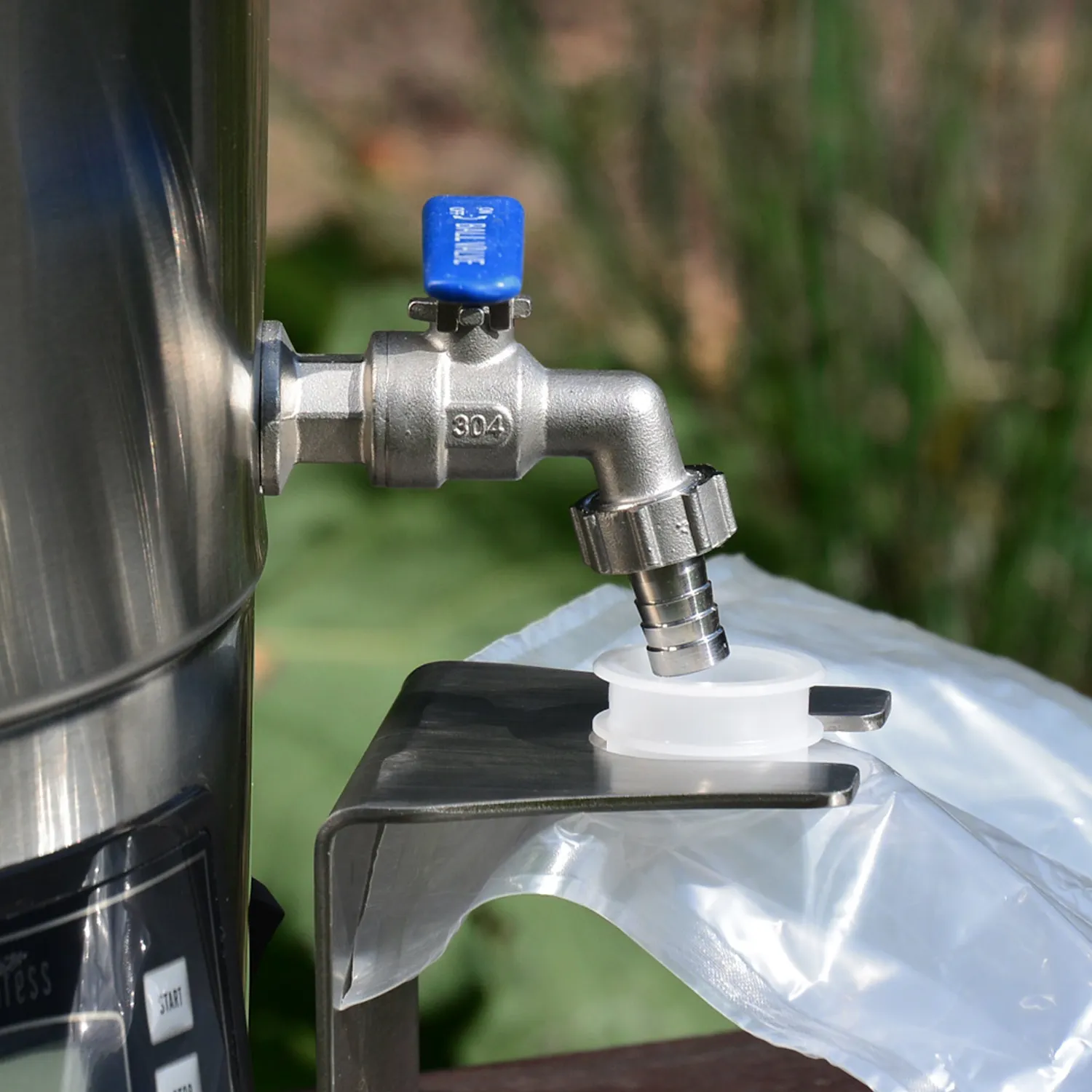 Den färdigpastöriserade musten tappas enkelt genom den rostfria kranen som sitter på sidan av pastören. Tappkranens placering är anpassad så att vår Bag In Box-hållare perfekt passar under den, vilket möjliggör smidig tappning av musten direkt ner i en Bag In Box-påse eller Ståpåse.