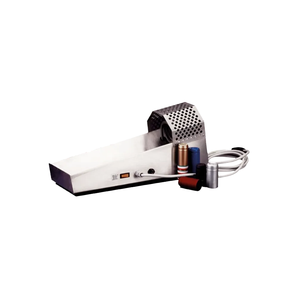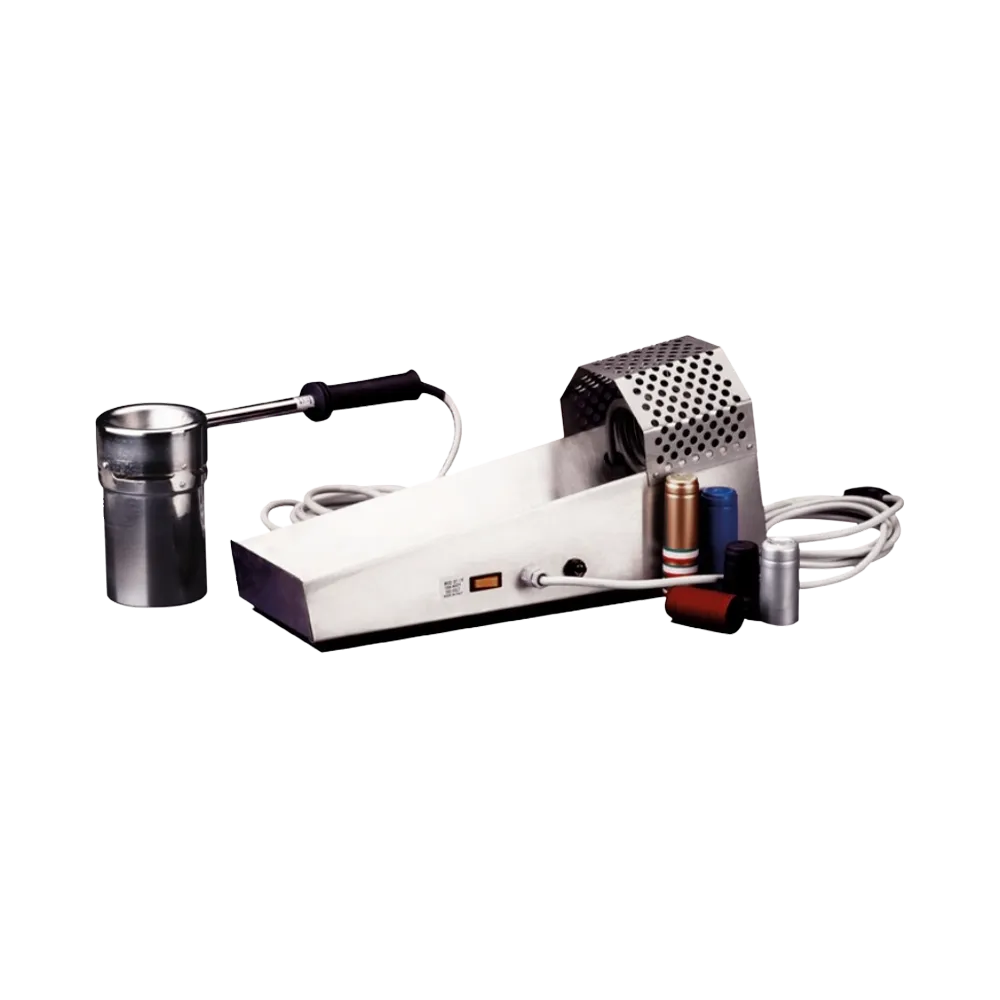 Med krympmaskinen förseglar du enkelt dina krymphättor över flaskhalsen. Koppla in i vägguttaget och sätt igång! Krymphättan ger ett elegant utseende till din flaska. Vi erbjuder flera olika typer av utföranden, spole med isolerat handtag eller bänkmodell med värmeskydd runt spolen. Krympmaskinerna är helt elektriska.
