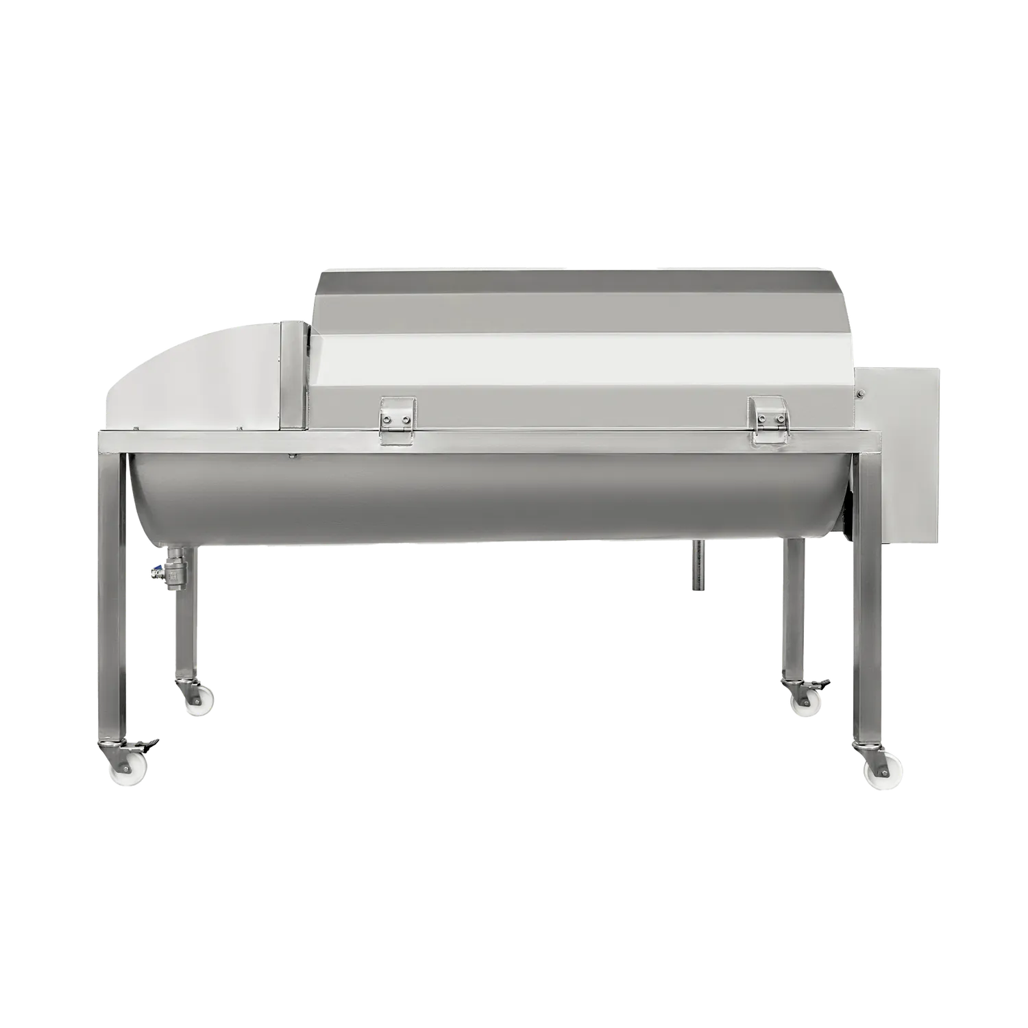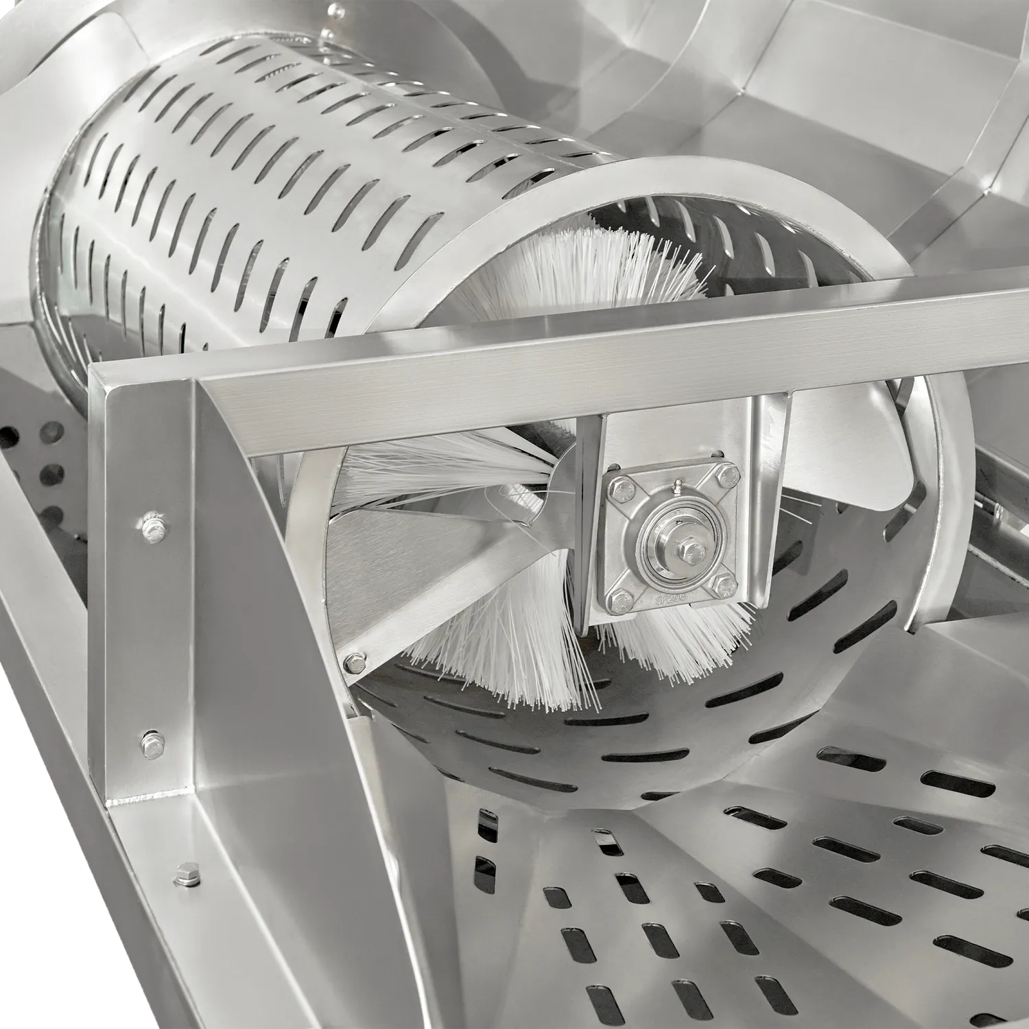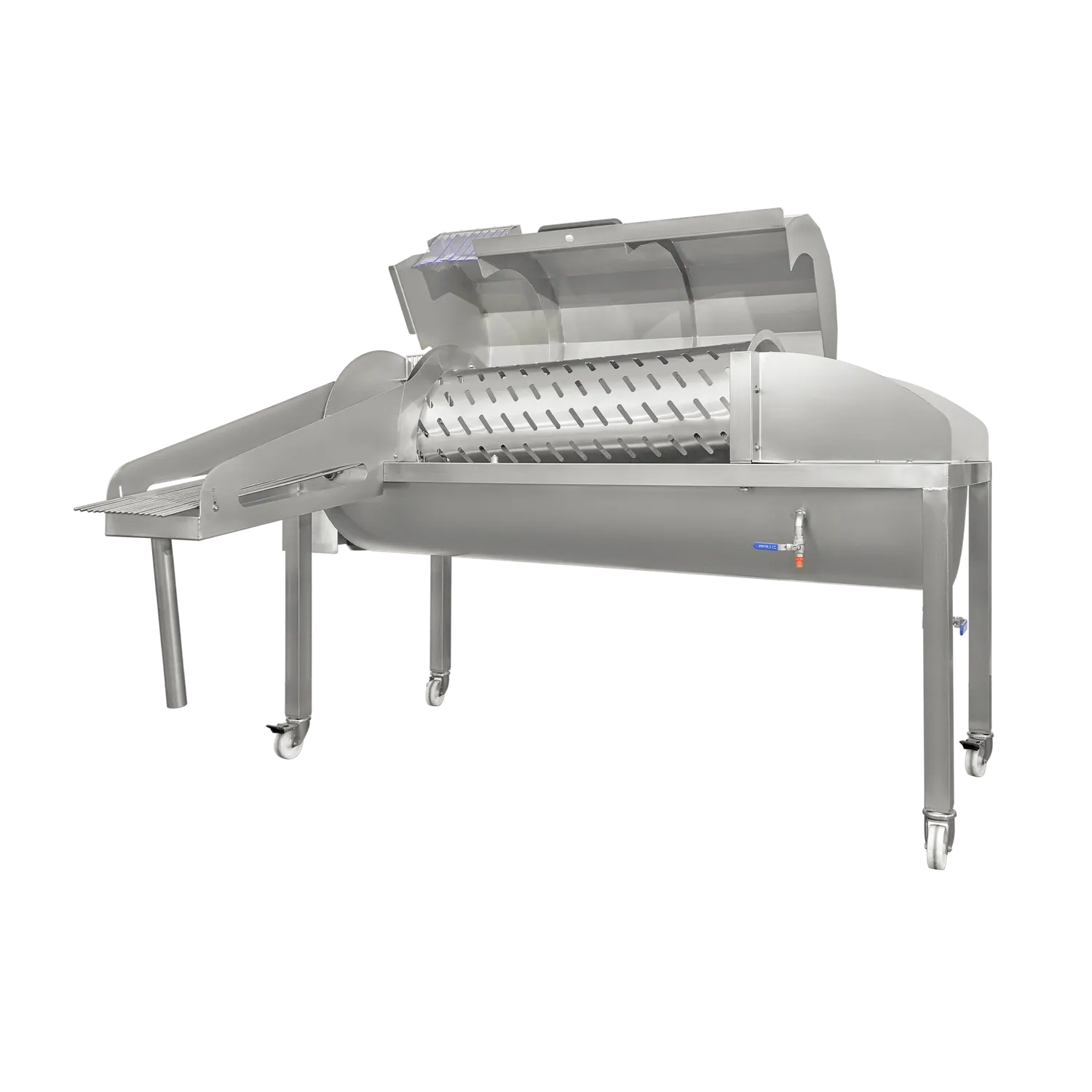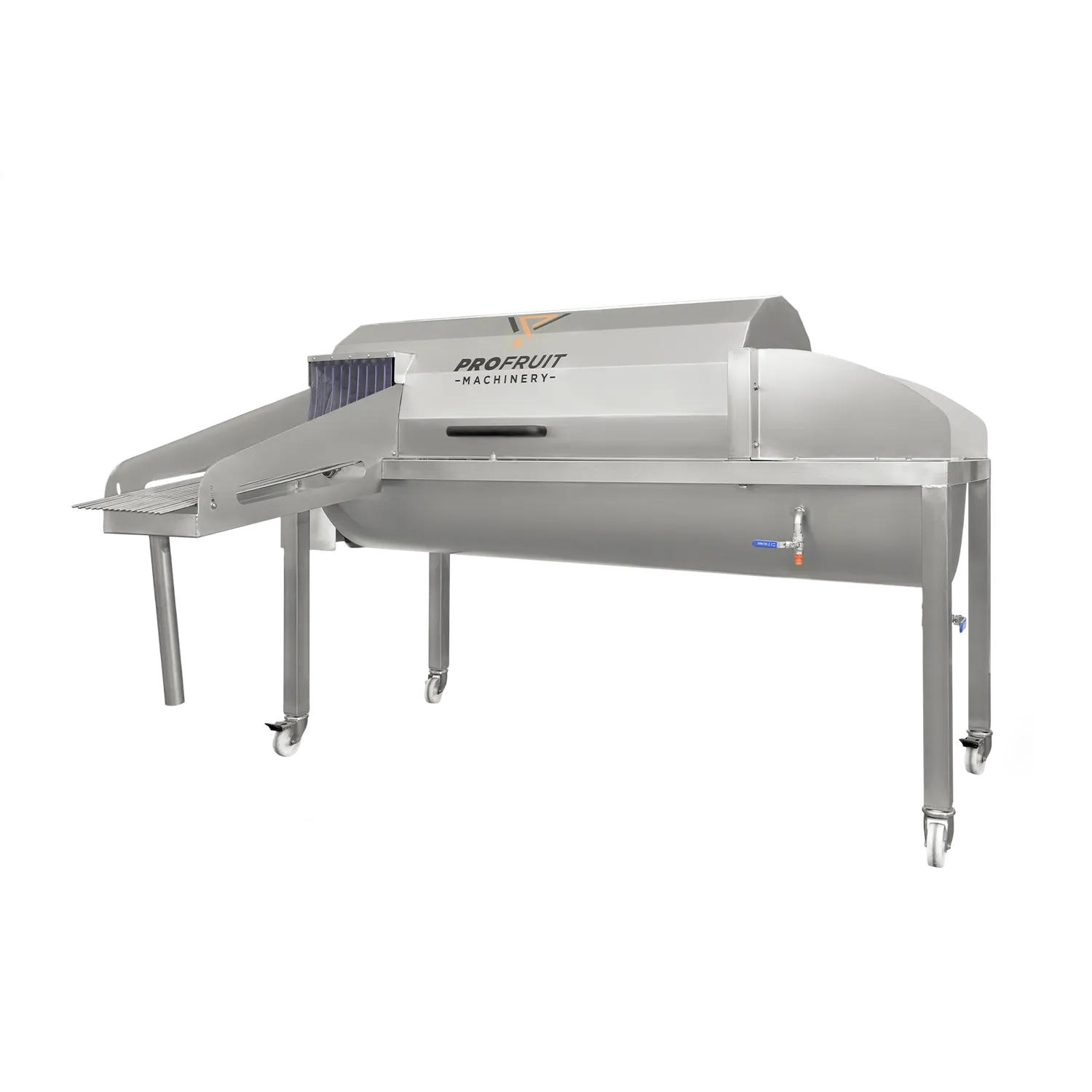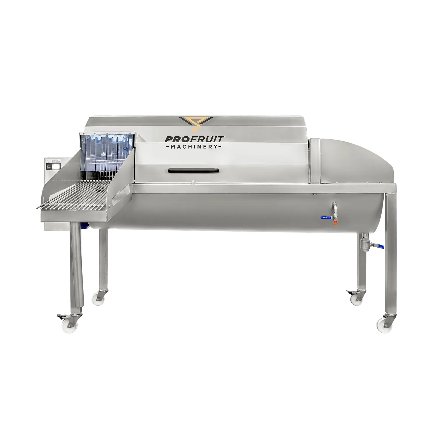 Frukttvätt Aqua 3000 är en effektiv och lätthanterlig maskin som tvättar frukt och grönsaker med en kapacitet på 3000 kg per timme. Tack vare tvättens skonsamma borstar rengörs frukten noggrant utan att skadas. Den är monterad på svängbara hjul som underlättar förflyttning av tvätten. Maskinen är tillverkad helt i rostfritt stål AISI 304. Den har ett täcklock som enkelt kan öppnas för inspektion och rengöring. Det går att justera tvätthastigheten vilket gör det möjligt att skapa en kontinuerlig process med resterande linje. Frukten tvättas med nytt vatten som tillförs via ett särskilt uttag. Det överflödiga vattnet rinner ut efter tvättningen.