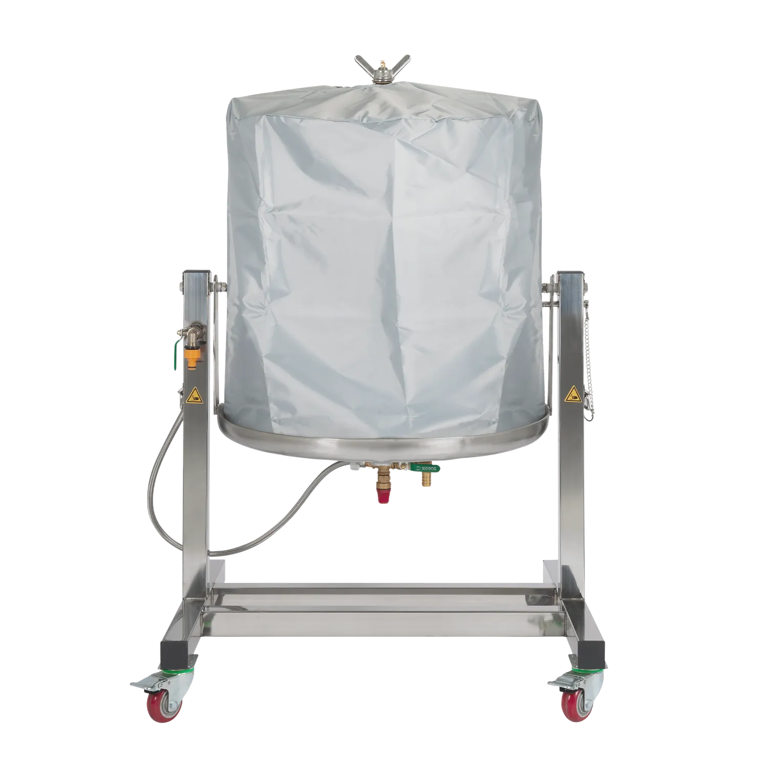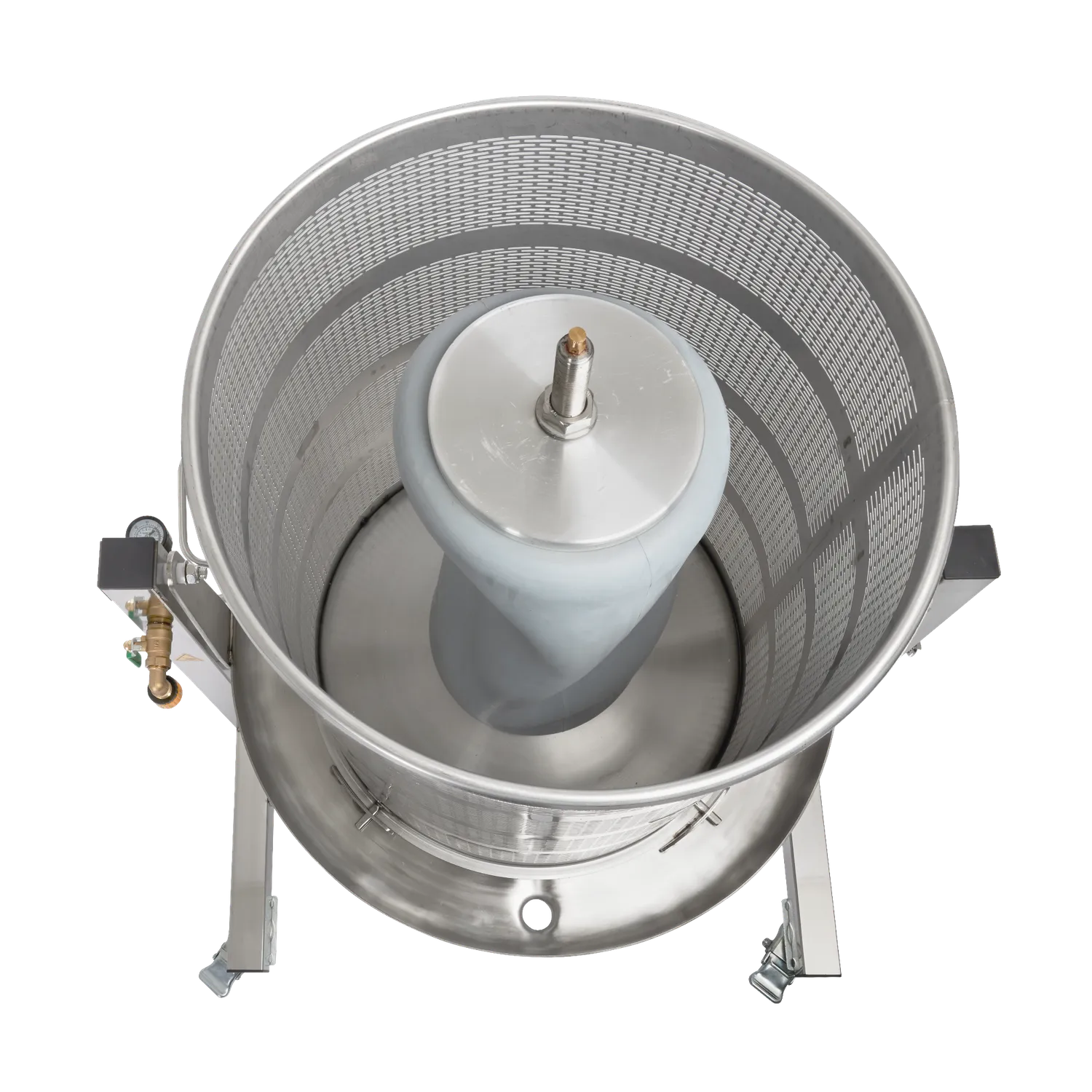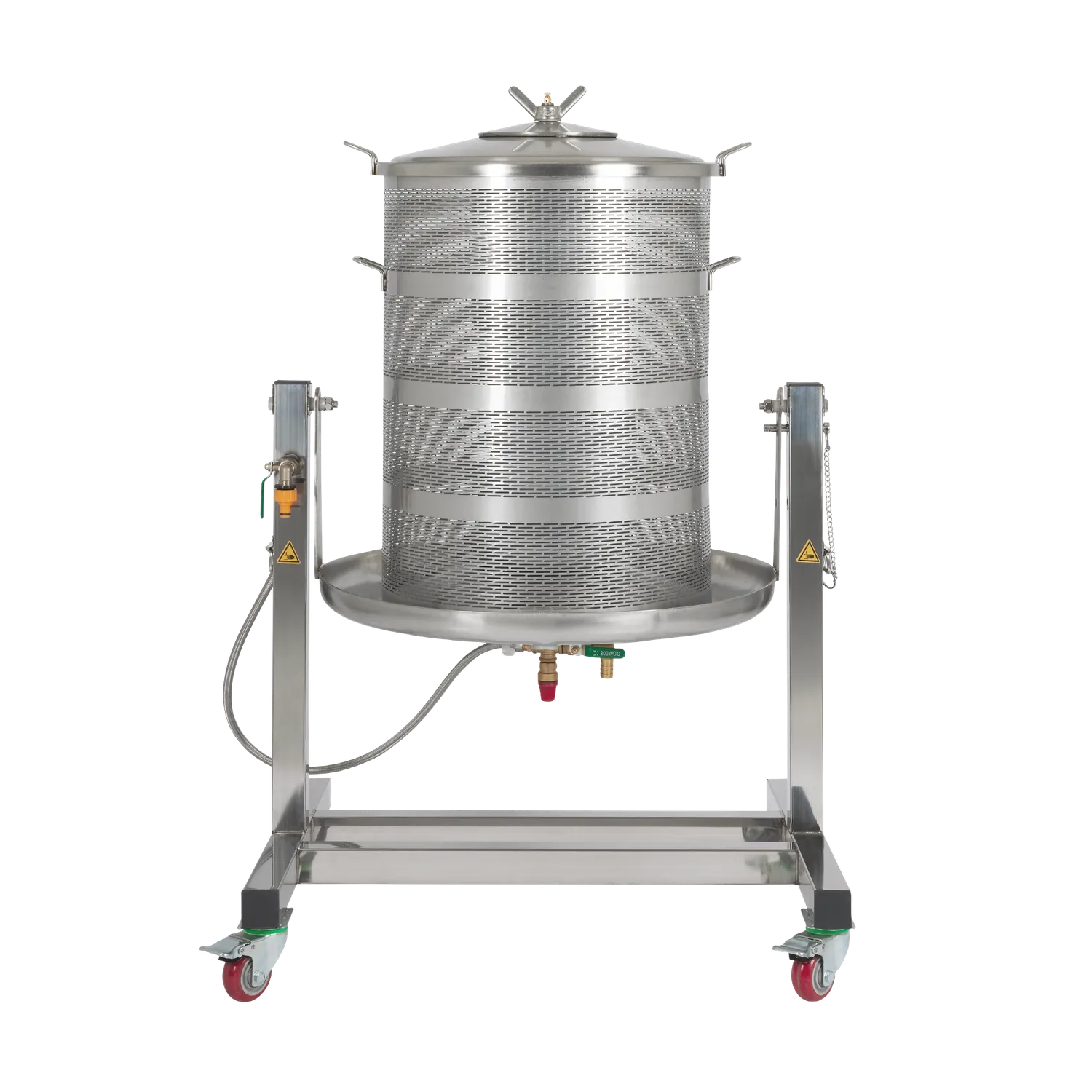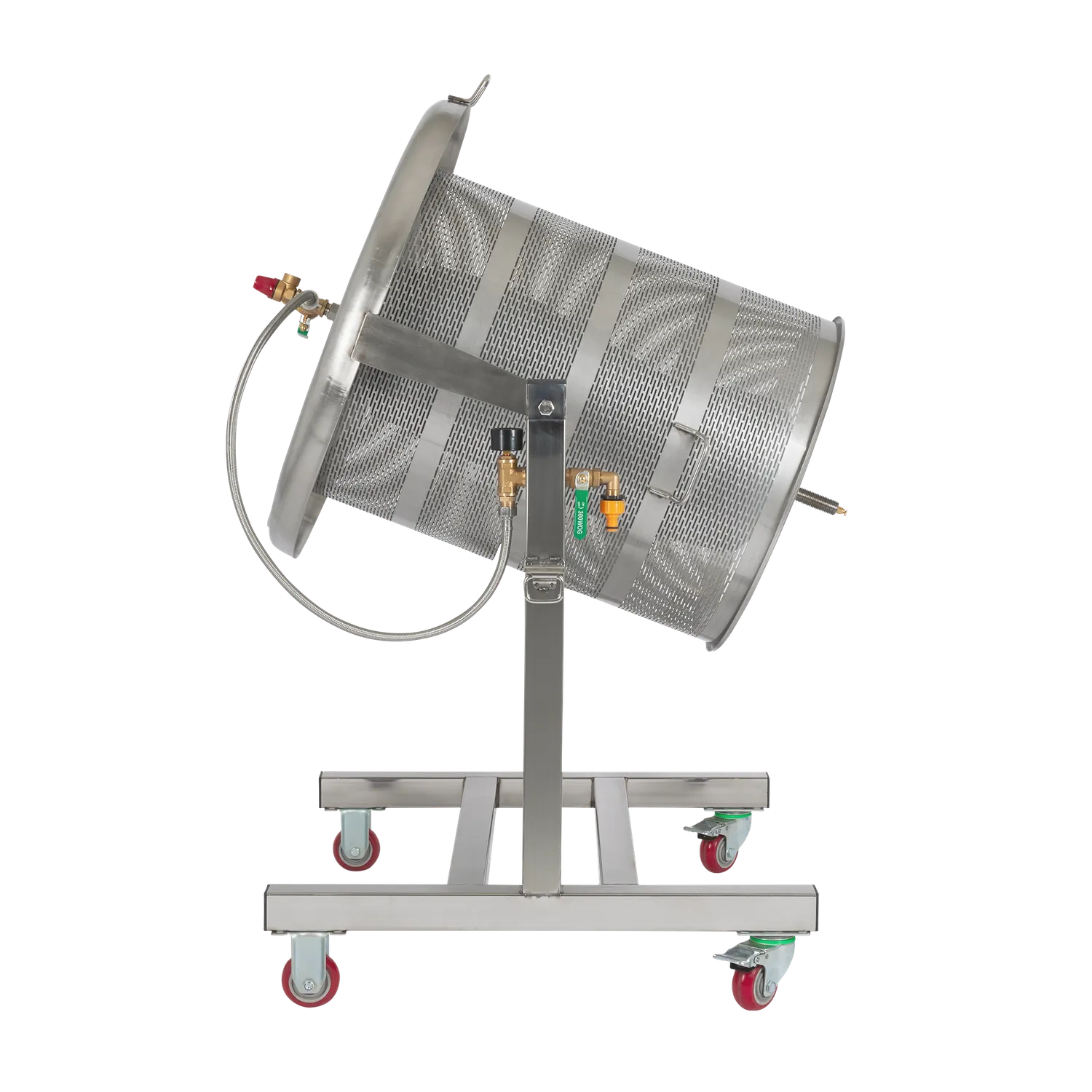 Dette er en vippbar versjon av vår Hydropresse 90 L. Pressen er montert på en ramme i rustfritt stål som gjør det mulig å vippe presskurven ved tømming. Dette forenkler arbeidet ved tømming av fruktrester.