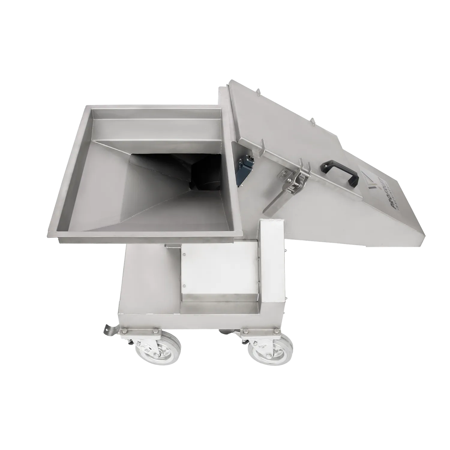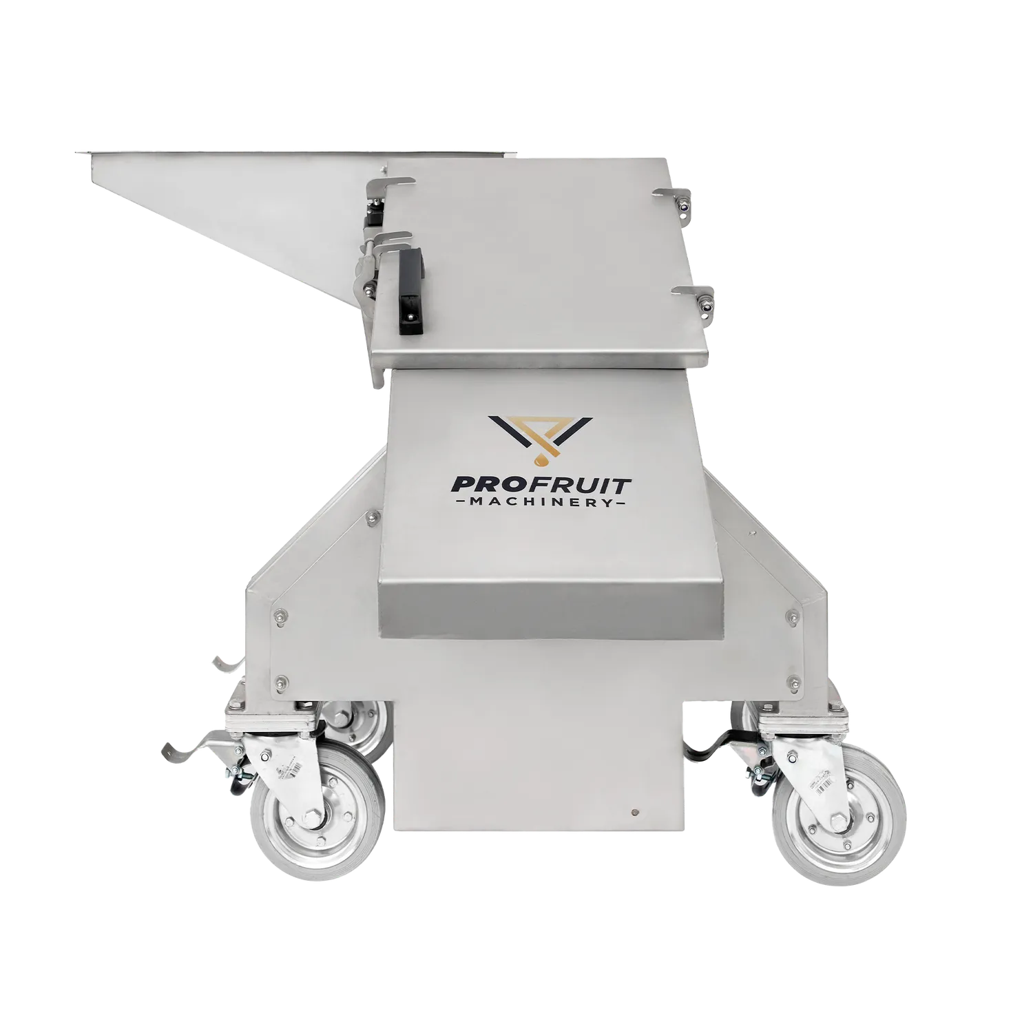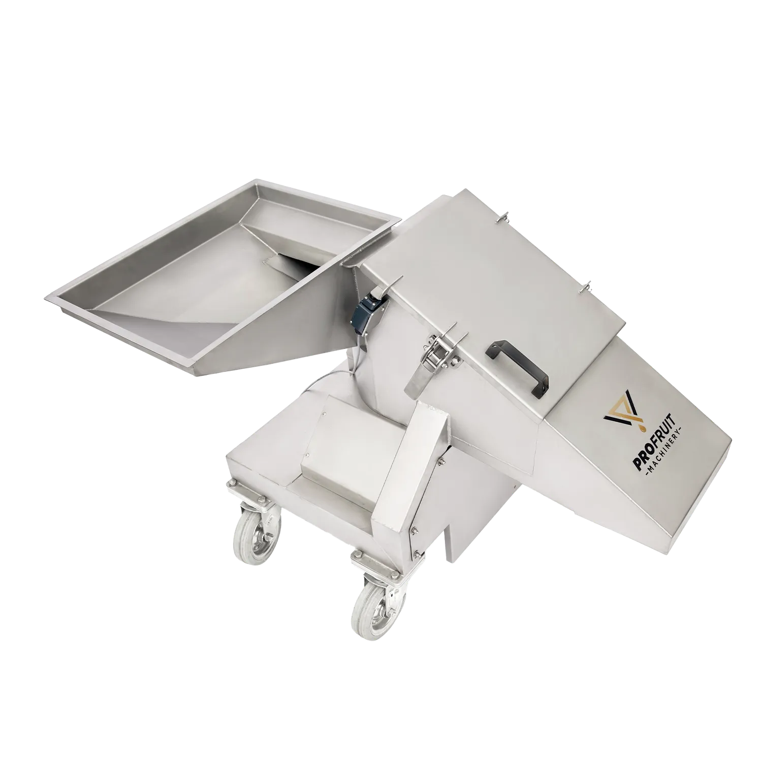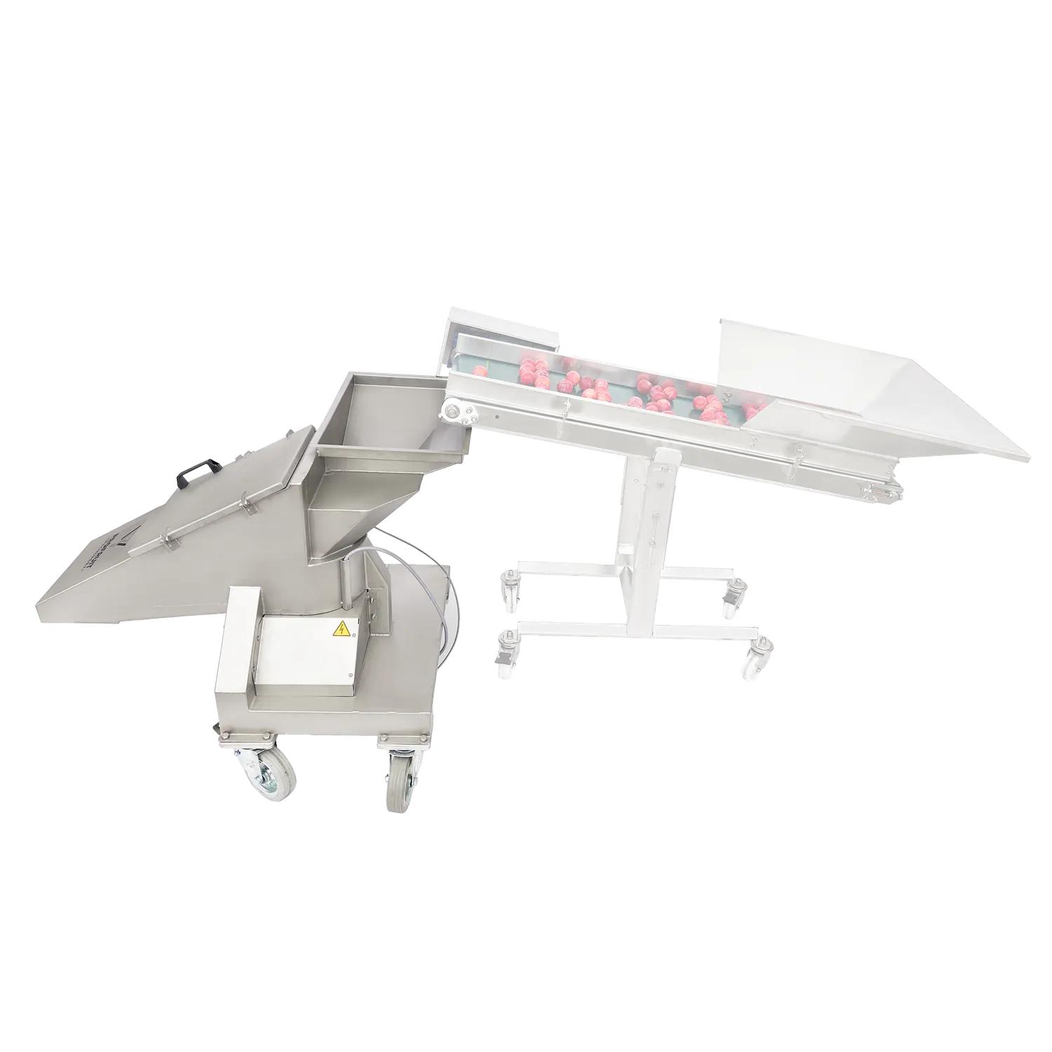 Bær- og fruktknuseren kan håndtere flere forskjellige typer frukt, bær og grønnsaker. Avhengig av hvilken type bær, frukt osv. du ønsker å kjøre, tilpasses en sil inne i knuseren til produktet. Maskinen er også i stand til å knuse steinfrukter takket være den spesielle utformingen av kvernen, som ikke skader frøene. Maskinen kan mates gjennom matebeholderen ved hjelp av en tipp, et transportbånd eller ved å helle produktene manuelt fra en kasse. Under utløpet er det mulig å plassere en monoskrue eller annen pumpe med oppsamlingskar og deretter overføre bær-/fruktmassen til videre bearbeiding.
